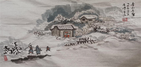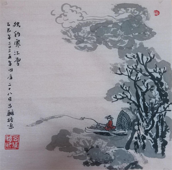 傅香是家族第三代画家,她的女儿吕雅娇是第四代实力派画家,受母亲傅香的熏陶,她三岁传承绘画艺术,一生酷爱画敦煌壁画中观世音菩萨、飞天、兰草、树木,主攻山水、仕女画。十二岁那年寒假,她跟妈妈在敦煌书画院敬画莫高窟壁画中菩萨,十八岁考入北京一个大学美术绘画,在校四年,美术老师常常将吕雅娇画的色彩,速描,速写,在校园绘画榜上展出,画风格逐显独特。吕雅娇大学毕业后当过一段美术老师,后来走上了职业画家之路,她画的香山冬雪、敦煌月牙泉、阳关、独钓寒江雪等作品,画面构图空灵,毛笔功夫非凡,笔墨浓淡干湿和观察事物的慈悲心,宣纸上大片留白,让收藏此幅画的人心突然间静下来。吕雅娇的水墨画《独钓寒江雪》是用毛笔手绘,具有古风的写意画韵味,意境空灵,画面大片留白,显示出画家在生活里修行,懂得放下的心境与情操。