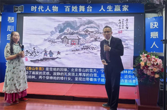 傅香现场展示了几幅作品原件,并与北京时代英杰经济文化院院长李笑天进行了简单的互动。对话中,她好像生活在魏晋时期的文人,“不知有汉,无论魏晋”,不食人间烟火。虽然文化江湖骗子把她骗到了北京,但是北京20多年的香山隐居生活成就了她的艺术,她不仅不恨那个骗子,还对他充满感激,因为她离开了自己的家乡到几千里地之外的京城生活,让她有机会接触各界高人,甚至应邀在中南海和乾隆皇帝的书斋作画。她实现了由敦煌壁画的临摹者到写意画的独立创作者,并成长为具有鲜明个人风格的艺术家的转变。她甚至认为,农家烧火做饭屋顶冒烟也是违法的;生活中她除了手机之外,拒绝一切现代化用具,包括空调、冰箱等都不用,以清心寡欲、淡泊之心对待日常生活,不管他人出于什么目的与她交往,她都像一个孩子一样真诚地对待世人。她画画挣钱不多,但还时常买来鱼、乌龟放生,她用自己的实际行动践行菩萨心肠、慈悲为怀。